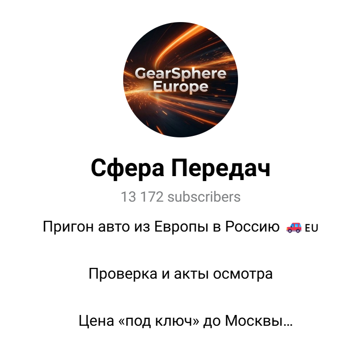 Рассматриваемый канал доступен по ссылке sfera_peredach в Телеграмме и ориентирован на продажу авто. В описании администратор заявляет о пригоне машин из Европы в Россию. Также в качестве плюсов указывается детальная проверка и предоставление актов об осмотре.