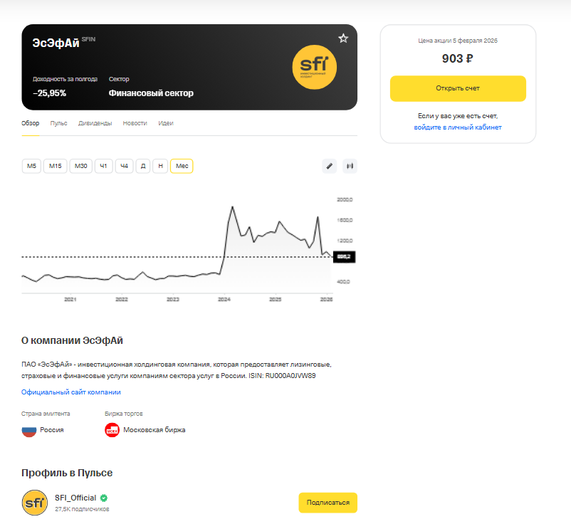 Начало 2026 года уже ознаменовано тем, что стоимость акций SFI резко снизилась. Первопричиной такой тенденции стала продажа дочерней компании «Европлан» «Альфа Банку». Кроме того, аналитики отмечают рост количества розничных инвесторов, причем большинство из них торгуют в коротких временных промежутках. Разумеется, такая тенденция является неблагоприятной для инвесторов, которые уже держат акции. Зато есть те, кто желает купить их сейчас по низкой цене, чтобы в будущем заработать на росте. Вот только прогнозы аналитиков такой оптимистичный план пока что не предсказывают.