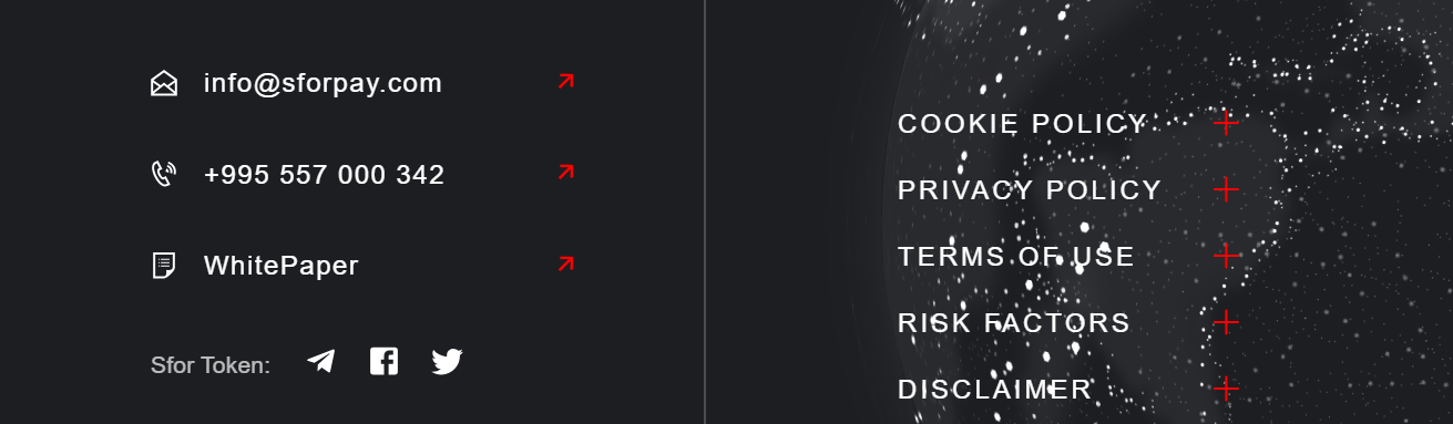 Разработчики утверждают, что ведут переговоры относительно листинга с пятьюдесятью ведущими CEX биржами, первоначально для торговли будет доступна только валютная пара с USDT, далее планируется расширение торговых пар. Тейкинг или фарминг монет не предусмотрен. Как указано в WhitePaper проекта, никаких нативных комиссий за переводы монет не предусмотрено, потребуется только оплата газа внутри сети. Разработчиком указан Cyber Security Group LLC (Группа кибер безопасности), юридический адрес находится в Грузии, Тбилиси. Адрес почты info sforpay com и телефон компании с сайта токена совпадает с данными из других источников, контора занимается консультациями в области ПО, а также разработкой программ.