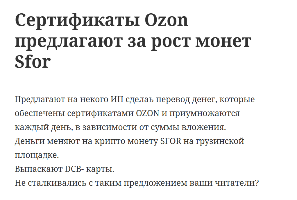 На других сайтах обнаружились несколько иные данные о деятельности компании-разработчиков Sfor – пользователям предлагается заработать на продаже и покупке сертификатов маркетплейсов Озон и Wildberries. Профит участников якобы будет конвертироваться в токены. На самом официальном ресурсе Сфор никаких упоминаний о подобном виде сотрудничества нет.