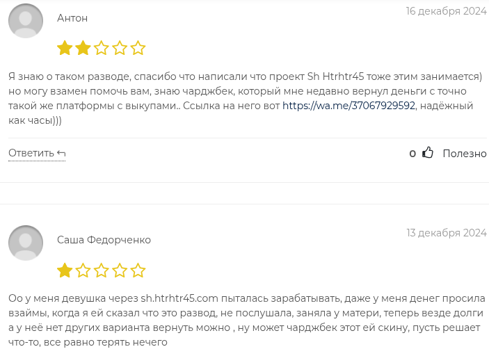 Довольных пользователей на внешних платформах мы не нашли. Но есть отрицательные отзывы, которые мы нашли в ходе проверки Sh Hrthtr45 com. Пользователи пишут, что финансовый ресурс — развод.