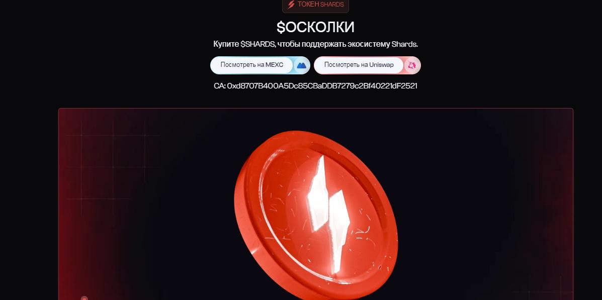 Главная страница выглядит минималистично — крупный призыв купить токены SHARDS и ссылки на биржи. Дизайн в духе современных Web3-проектов: темный фон, контрастные акценты, но без изысков. Контракт токена указан открыто, что добавляет прозрачности.