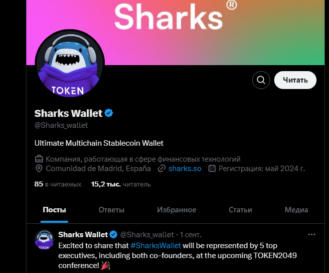 В футере есть информация о том, что у криптокошелька Sharks Wallet есть страницы в Х, Discord и Medium. Но информация на них обновляется очень редко. Например, в Х последнее сообщение датируется 01 сентября, а мы проводили свою проверку 15 октября 2024 года.