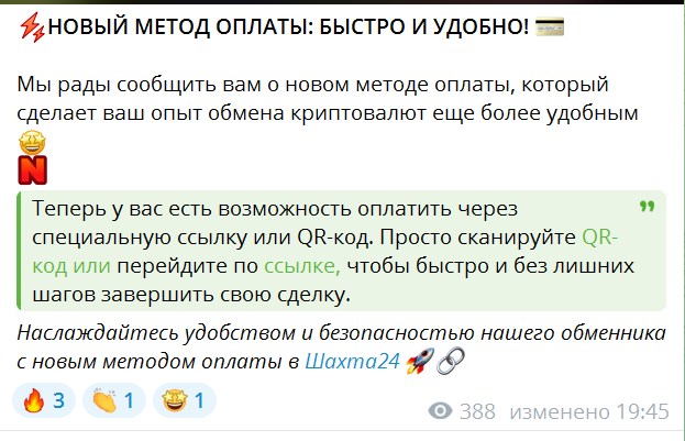 Мы не рекомендуем работать с обменником Shaxta24 Bot. Можно им пользоваться, но лучше этого не делать регулярно, есть риск потерять свои деньги.