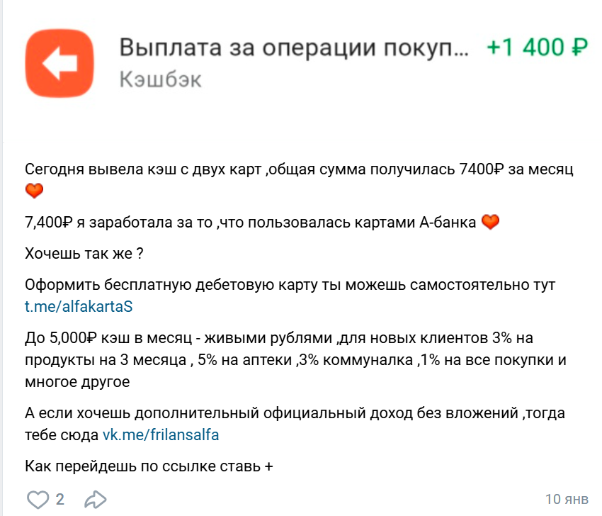 Во-вторых, это партнерская программа, тесно связанная с проектом “Свой в Альфе” и оформлением дебетовых карт через реферальные ссылки. В постах появляется ссылка tme alfakartaS для заказа карты и vk me frilansalfa для подключения к партнерскому проекту.