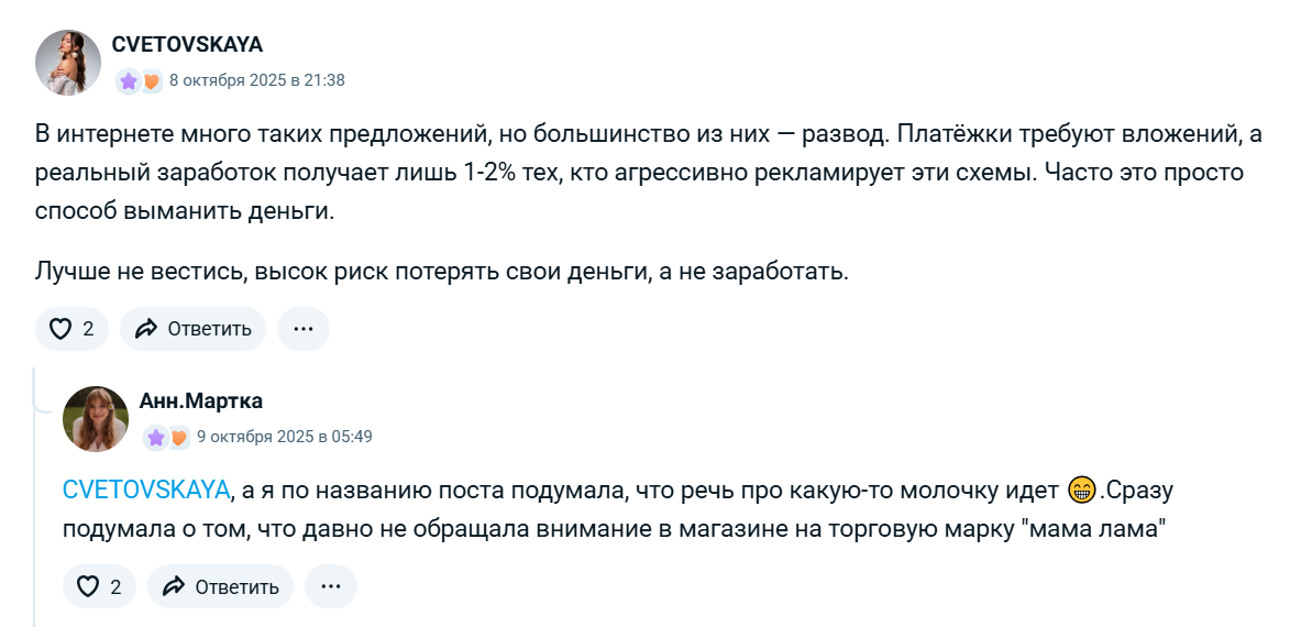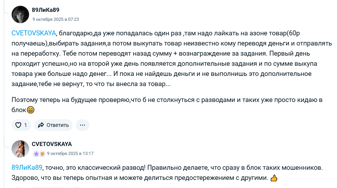 В независимых источниках другая риторика. Пользователи пишут, что уже сталкивались с подобными схемами, где сначала платят копейки за лайки и отзывы, а потом втягивают в выкупы с растущими суммами.