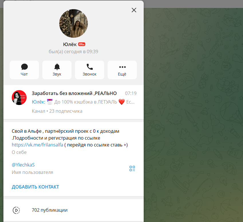 В телеграмм проект продвигает не только некто под никнеймом Юлия @YlechkaS. Встречаются имена Лиля или Катя, при этом схема подачи и тексты очень похожи.