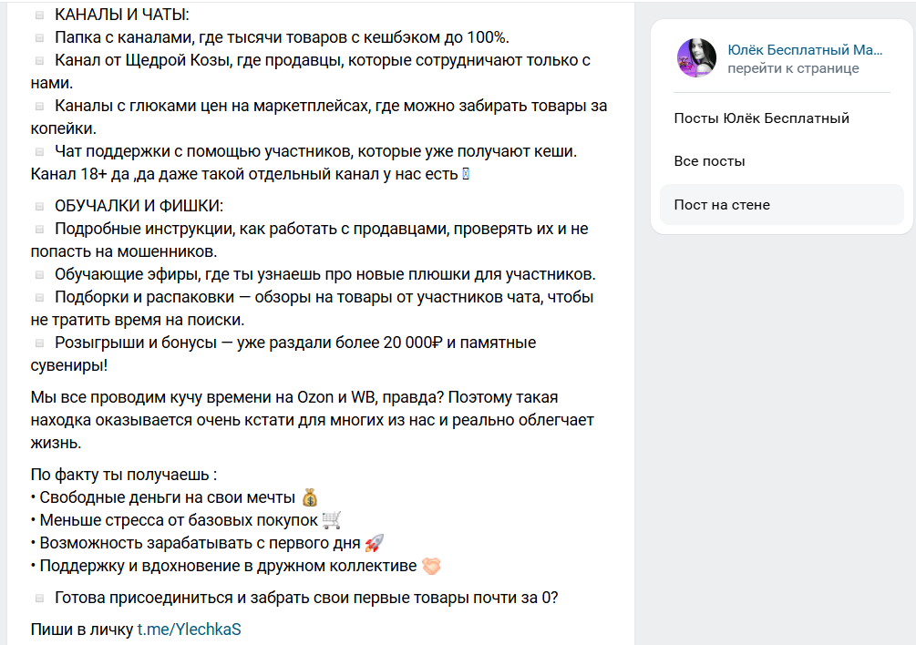 На канале много постов, сторителлинга про маму на удаленке, рассказы о том, как удалось выйти на доход без вложений, скрины кэшбэков на 5-7К рублей в месяц, обещания официального дохода, бонусов, поездок, розыгрышей и поддержки 24/7. Отдельный акцент на том, что проект якобы не про жадность, а про умные покупки, финансовую грамотность и возврат своих же денег.