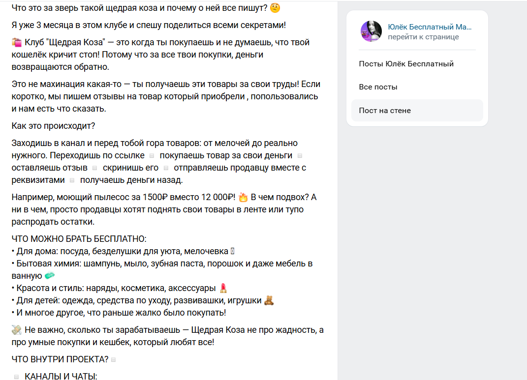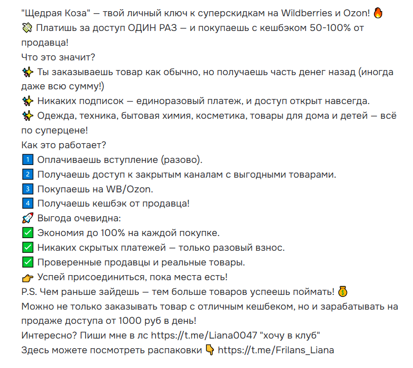 Площадка “Щедрая коза” — это проект про кэшбэк, выкупы товаров и партнерский доход, отзывы о котором активно продвигаются через личные сообщения, чаты и социальные сети. Выглядит проект привлекательно, особенно для тех, кто покупает на Wildberries и Ozon и давно слышал про возвраты денег за отзывы.