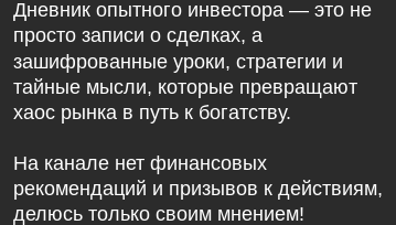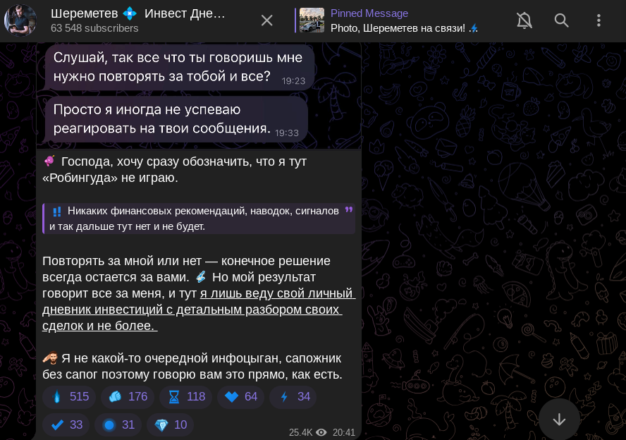 Первым делом отметим стандартное описание для подобных проектов. Автор проекта пишет, что его проект — уникальная платформа. На ней владелец якобы публикует лучшие уроки, стратегии, тайные мысли, которые помогут прийти к богатству. Помимо этого, автор телеграма «Шереметев Инвест Дневник», как и его коллеги, пишет, что в паблике нет финансовых рекомендаций и призывов к действиям.