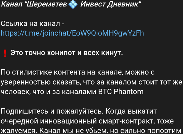 Шереметев Инвест Дневник — консультационный телеграм, в котором якобы профессиональный аналитик рассказывает про события в мире криптовалют. Автор считает себя опытным инвестором в цифровые монеты, а потому обещает, что каждый будет зарабатывать плюс к прибыли. Но при этом настоящую статистику успешных сделок демонстрировать не хочет. Сюда же добавим, что владелец проекта в телеграме не рассказывает про возможности диверсификации инвестиционных рисков.