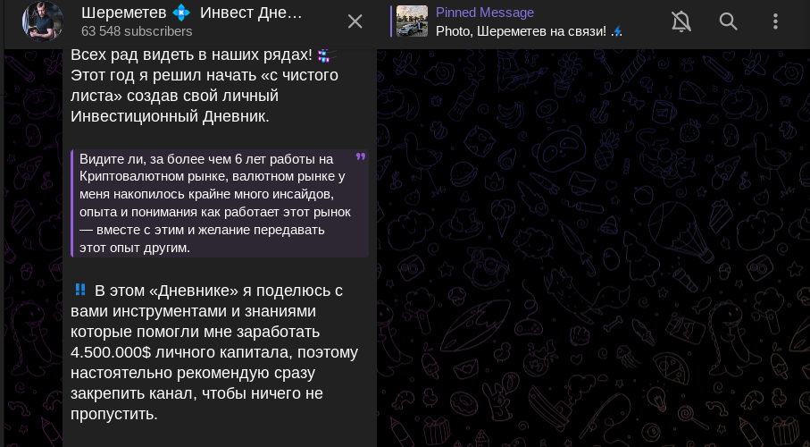 Владелец консультационного сообщества разместил ознакомительную публикацию. Во вступительном посту админ рассказывает, что он на рынке криптовалют свыше 6 лет и за это время заработал более 4.5 миллионов долларов. Далее разработчик инвестиционного телеграма «Шереметев Инвест Дневник» утверждает про легкость заработка на цифровых монетах.