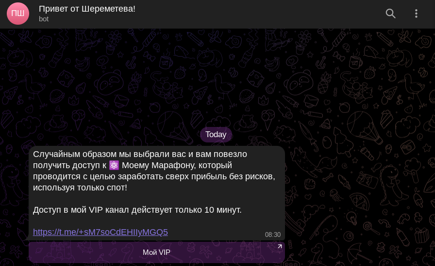Помимо анализа описания, мы проверили внутреннюю структуру телеграма «Шереметев Инвест Дневник». Форма участия приватная, т.е. чтобы ознакомиться с контентом сообщества, надо оформить подписку на паблик. Стоит отметить, что обращения на вступление обрабатывает бот, так как позже он отправляет спам-рассылку с предложениями услуг.