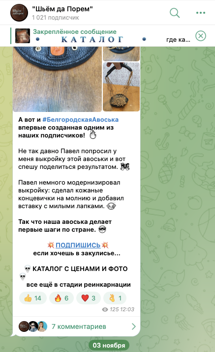 «Шьем да Порем» — магазин в Телеграмме, владельцы которого предлагают услуги по индивидуальному пошиву аксессуаров.