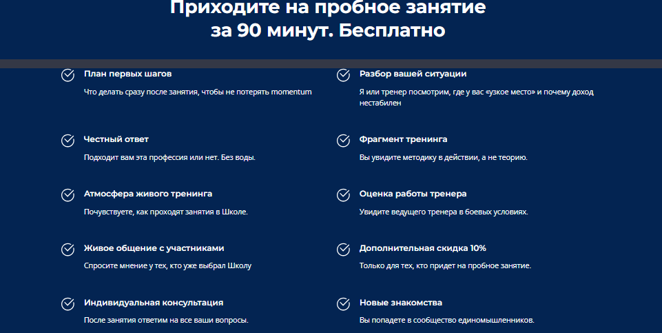 Часть модулей доступна в записи. Отдельно заявлены аттестация и супервизия. Основной акцент сделан на перспективах заработка. В описании продукта обещают: