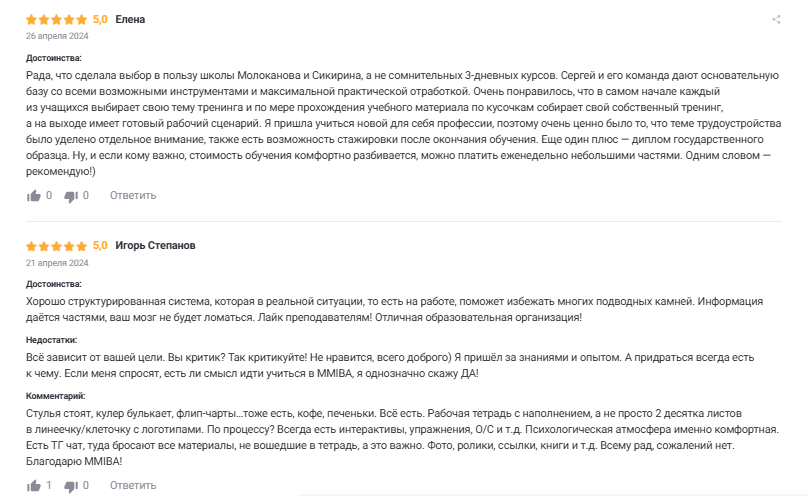 Школа Бизнес Тренеров Молоканова и Секирина отзывы, в основном, получила положительные. Но есть нюанс, практически все они размещены на ее официальном сайте или на Яндекс Картах.