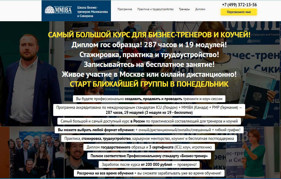 Проект Школа бизнес-тренеров Молоканова и Сикирина представляет собой типичную образовательную платформу в сфере дополнительного обучения с уклоном в инфобизнес.