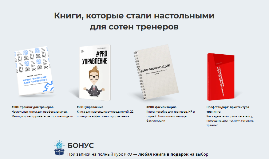 Кроме того, в пакет включено дополнительные бонусы: библиотека книг, готовые программы тренингов, портфолио (видео и фото), членство в клубе тренеров.