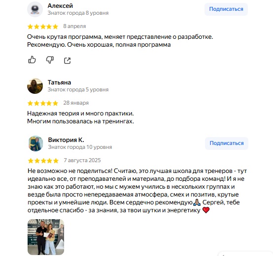 Также в команде заявлены другие тренеры, включая специалистов по коучингу, фасилитации, маркетингу и публичным выступлениям. При этом акцент сделан на экспертности внутри самой школы, но независимых подтверждений их квалификаций не представлено.