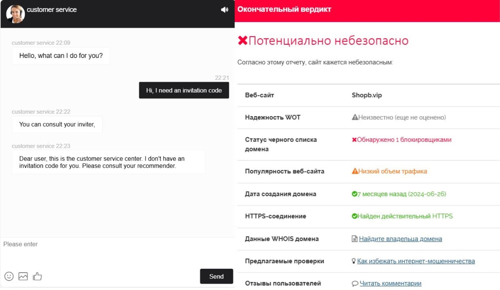 Домен shopb vip создан в июле 2024 года. Веб-платформа имеет низкий уровень доверия из-за небольшого трафика и сокрытия данных о владельцах сайта.
