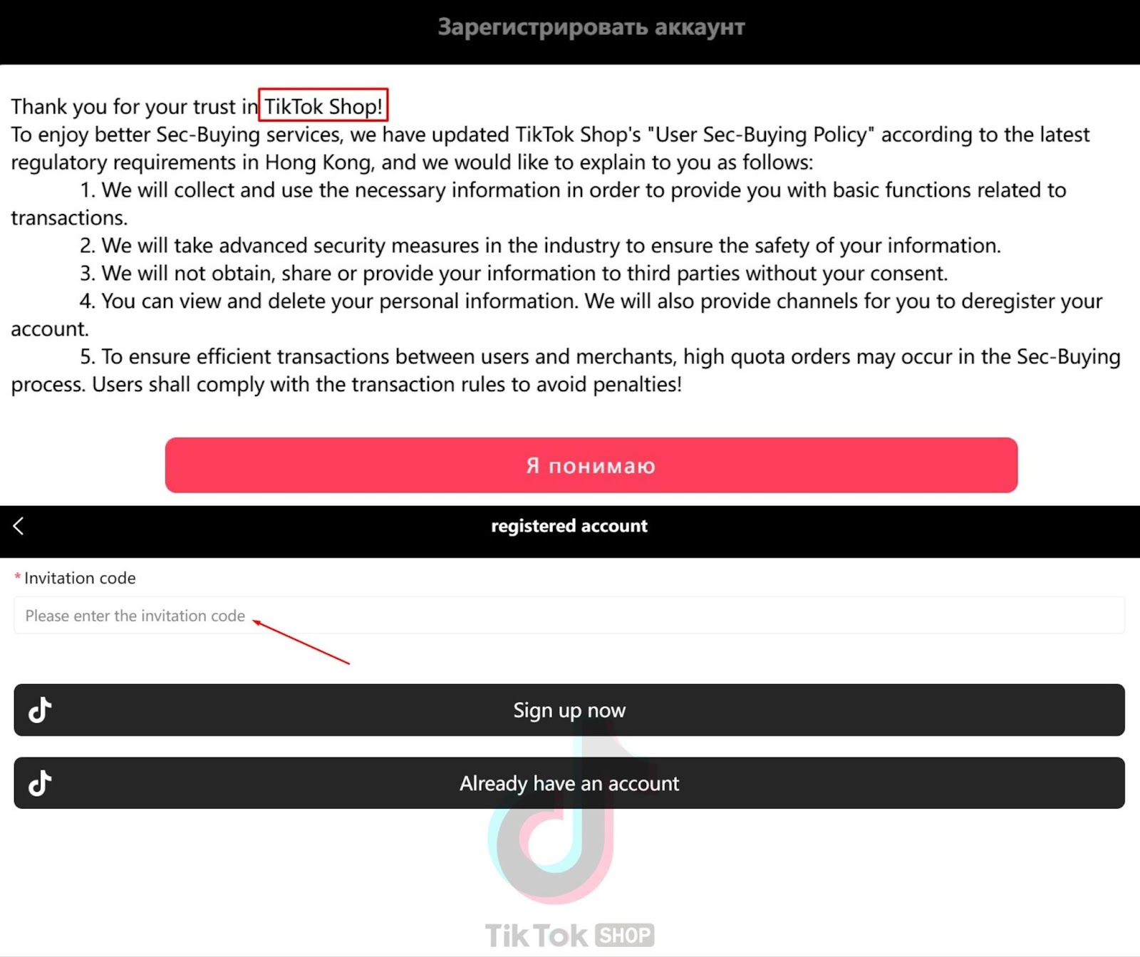 Перед регистрацией на сайте shopb vip, пользователю нужно подтвердить согласие на обработку персональных данных. Компания указывает на второе название платформы tiktok shopb vip. Но для авторизации аккаунта, система веб-ресурса требует ввод пригласительного кода.