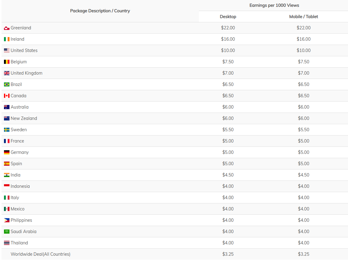 Что насчет заявленного заработка, то нас уже частично обманули. Дело в том, что 220 долларов за 10 тысяч переходов можно получить только от пользователей из Гренландии, которую почти никто не населяет. Далее идет Ирландия с $16 и США с $10. При этом стран СНГ в этом списке даже и нет. Они, видимо, попадают в категорию со всеми остальными государствами, вот только награда за тысячу таких просмотров составляет всего $3,25.