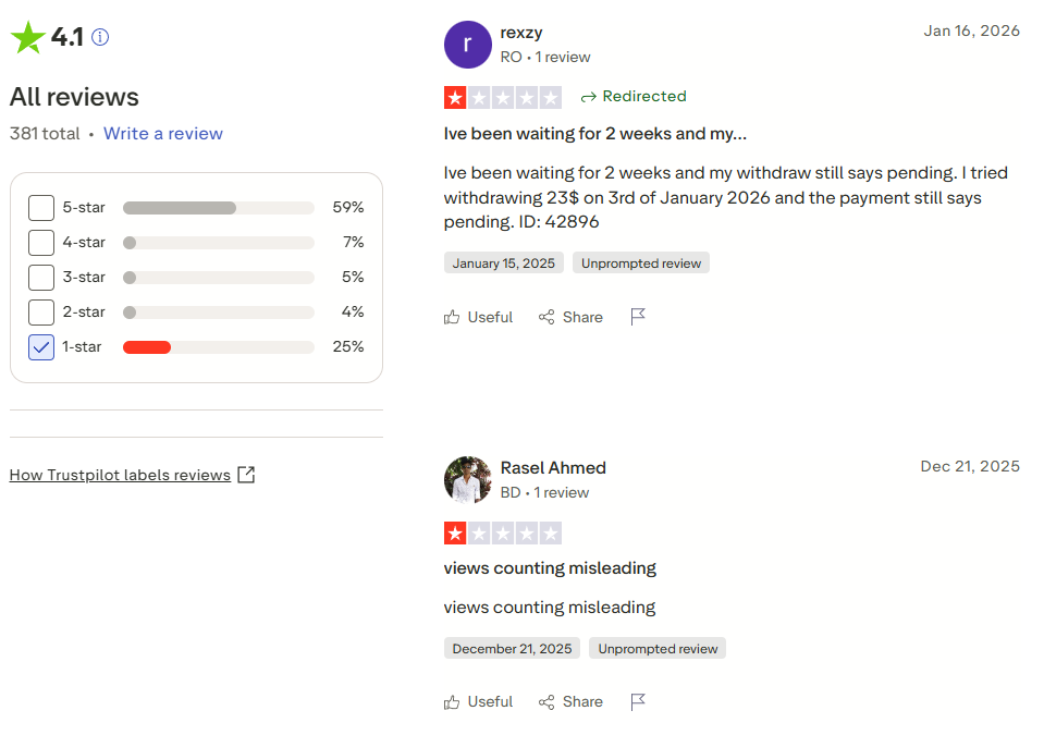 Хоть у Shrinkme Io неплохой рейтинг, судя по отзывам, однако много и негативных комментариев. Один из пользователей, например, пишет, что счетчик отображает неверные просмотры. Другой юзер ждет выплату уже на протяжении двух недель, в итоге он так ничего и не получил.