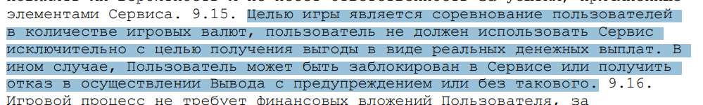 Еще и в лицензионном соглашении прямым текстом не один раз написано, что цель Силк Трейд Про – соревнование в накоплении игровой валюты, т.е. все внесенные сюда деньги считаются ненастоящими. Если же пользователь начнет претендовать на их вывод, то в ответ ему будет выдана блокировка. Расчет создателей, видимо, был на то, что никто не будет просматривать прикрепленный документ.