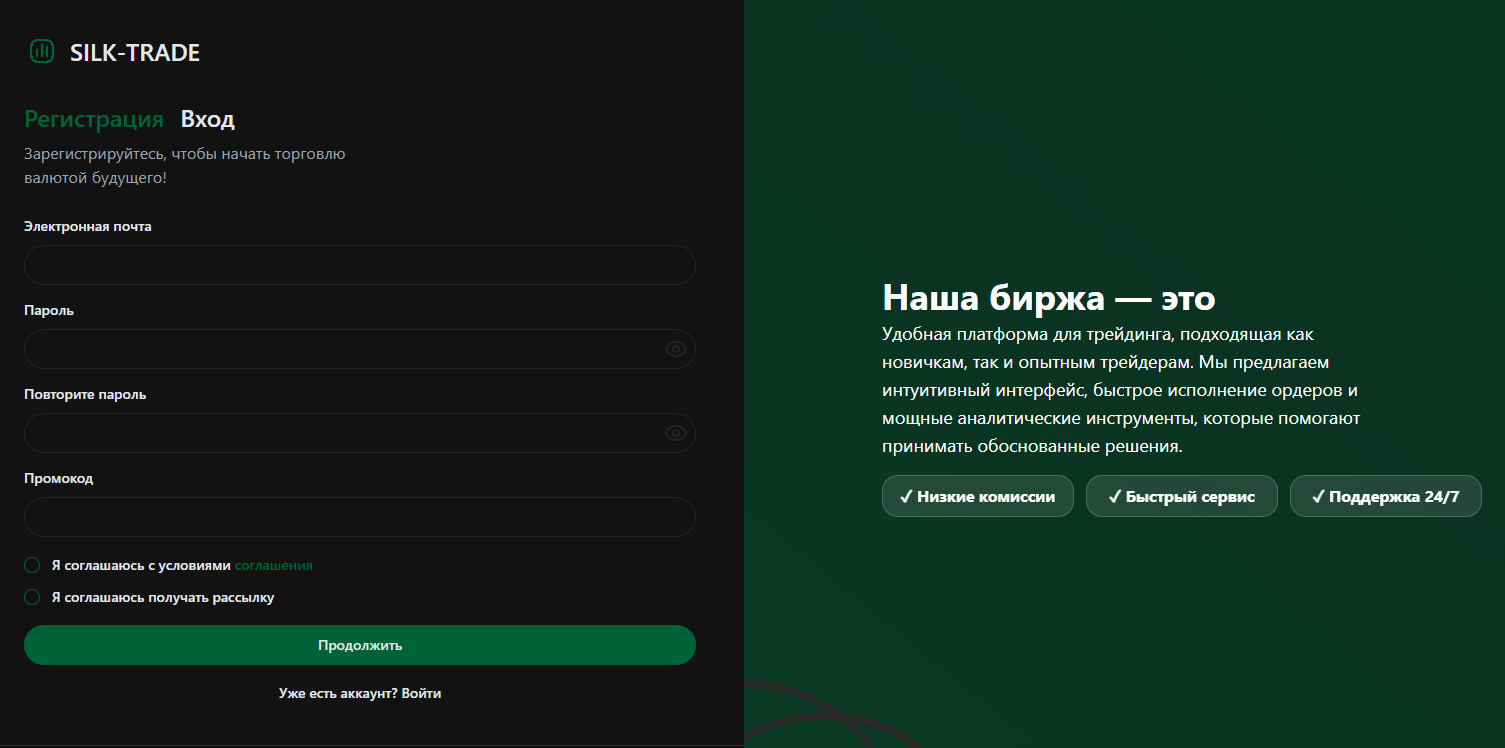 Дополнительным разделом здесь является окно регистрации, где для создания аккаунта необходимо наличие промокода. Справа же указано, что площадка предлагает интуитивно понятный интерфейс, круглосуточную поддержку, а также низкие комиссии и быстрый сервис. Но на подробности опять же рассчитывать не стоит: точные размеры сборов нигде не указаны.