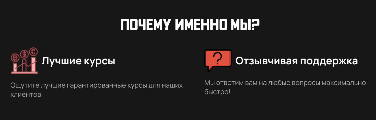 На главной странице веб-ресурса эксчейнджера заявлено, что на платформе возможен обмен по самым лучшим курсам. Эта запись противоречит закону о рекламе, и поэтому ее обычно не размещают на сайтах настоящих эксчейнджеров.