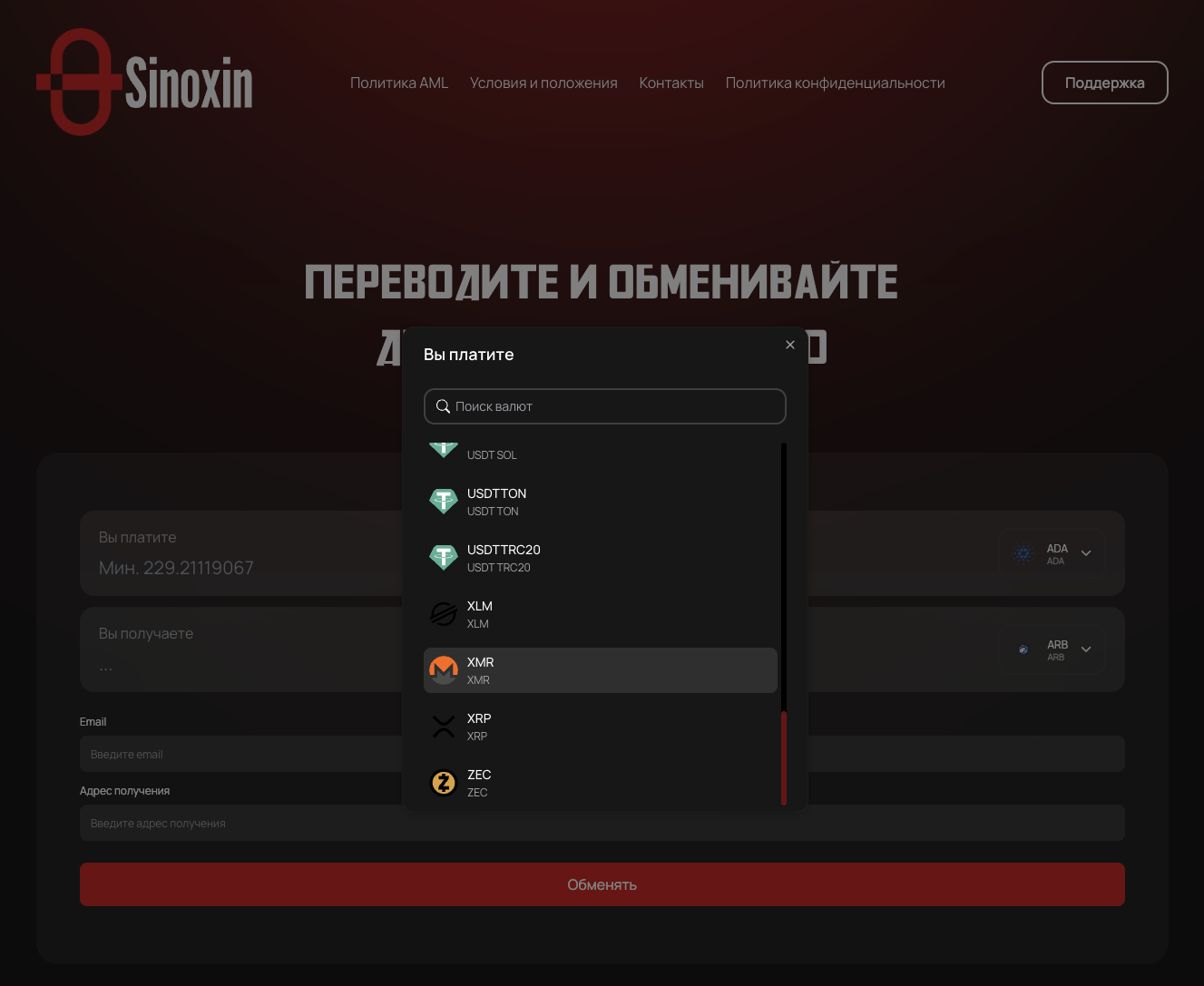 Sinoxin com — сайт криптовалютного обменника, на котором заявлена поддержка около двадцати видов цифровых активов. Среди них присутствуют самые востребованные на рынке токены, а также несколько видов USDT.