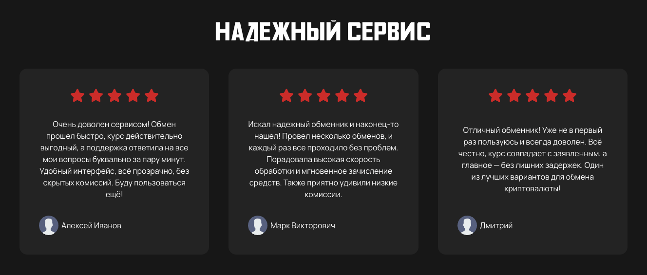 На главной странице сайта sinoxin com присутствует блок «Надежный сервис», который содержит отзывы об услугах обменника.