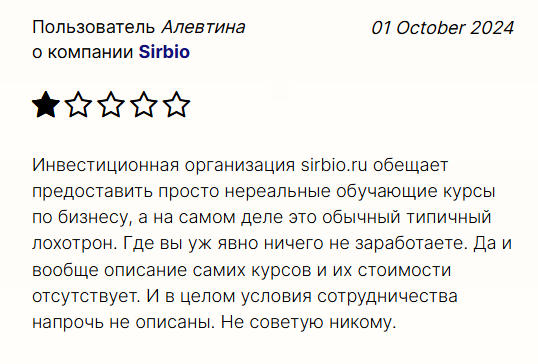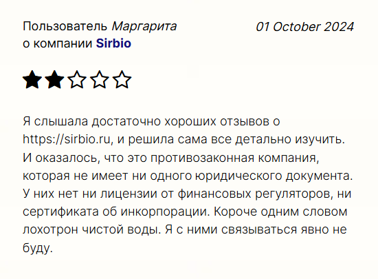 В сети мало отзывов об ООО Сирбио, но пользователи сравнивают проект с мошенниками, называют Sirbio лохотроном. Тот факт, что российский регулятор счел компанию неблагонадежной и внес в черный список, говорит о большом количестве жалоб на контору. Найти развернутые отзывы с разоблачением схем Sirbio и подтверждением, что это мошенник, не удалось. Контора за последние 4 года проиграла судов на сумму 3,7 млн рублей, также против нее было возбуждено 7 дел от налоговой службы. Это негативные факторы.