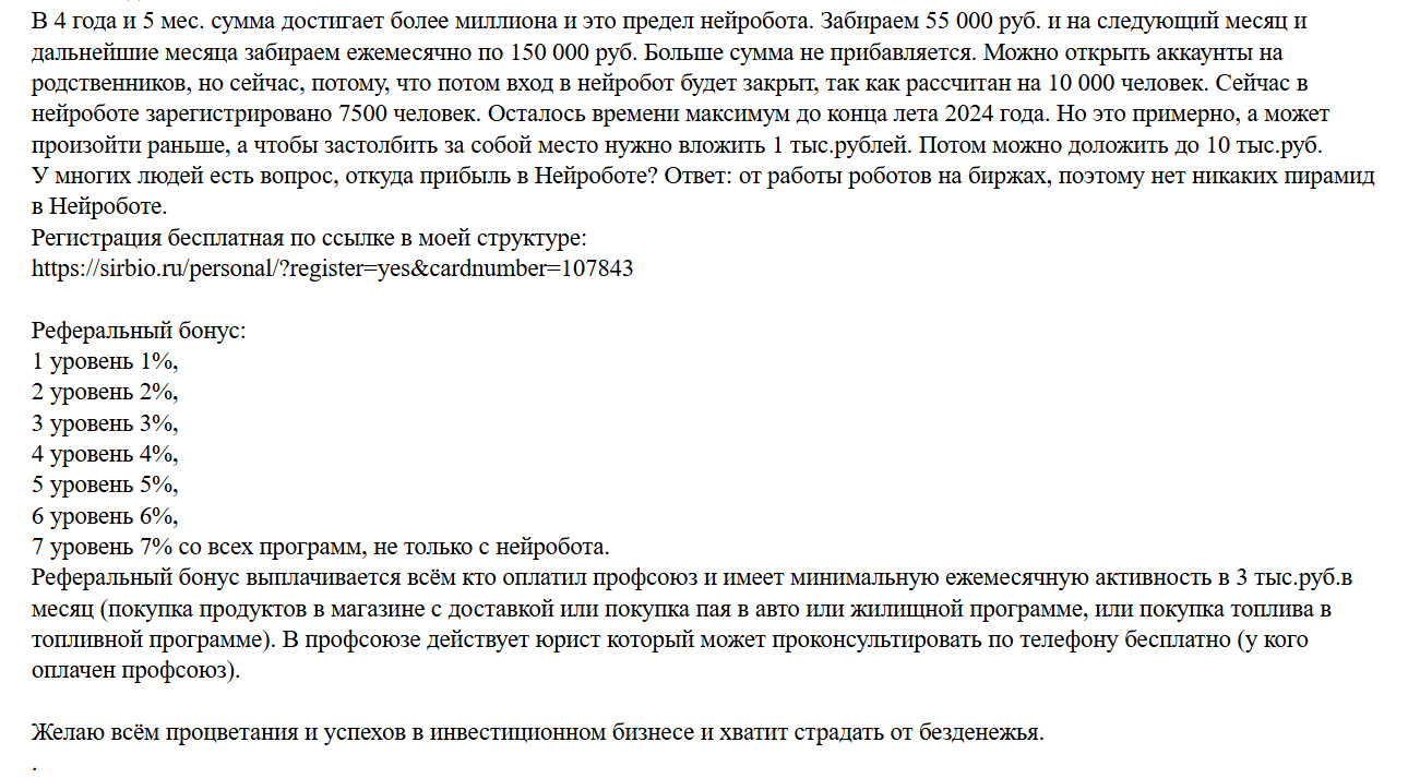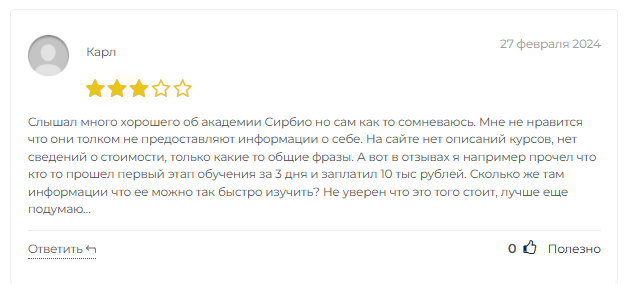 - в сети обнаружены негативные отзывы о нейроботе компании Сирбио и ее курсах.