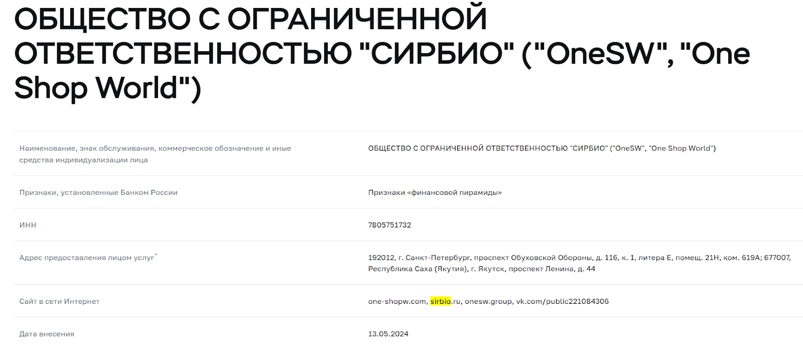 О компании Сирбио ру отзывы людей найти крайне сложно. Sirbio ry — пирамида, действующая под видом образовательного проекта. Этот факт установлен российским регулятором, о чем в реестре есть запись от 13 мая 2024 года. Это означает, что в Центробанк обратилось большое количество людей с жалобами на компанию. В обзоре выясним, что предлагает клиентам контора Сир Био.
