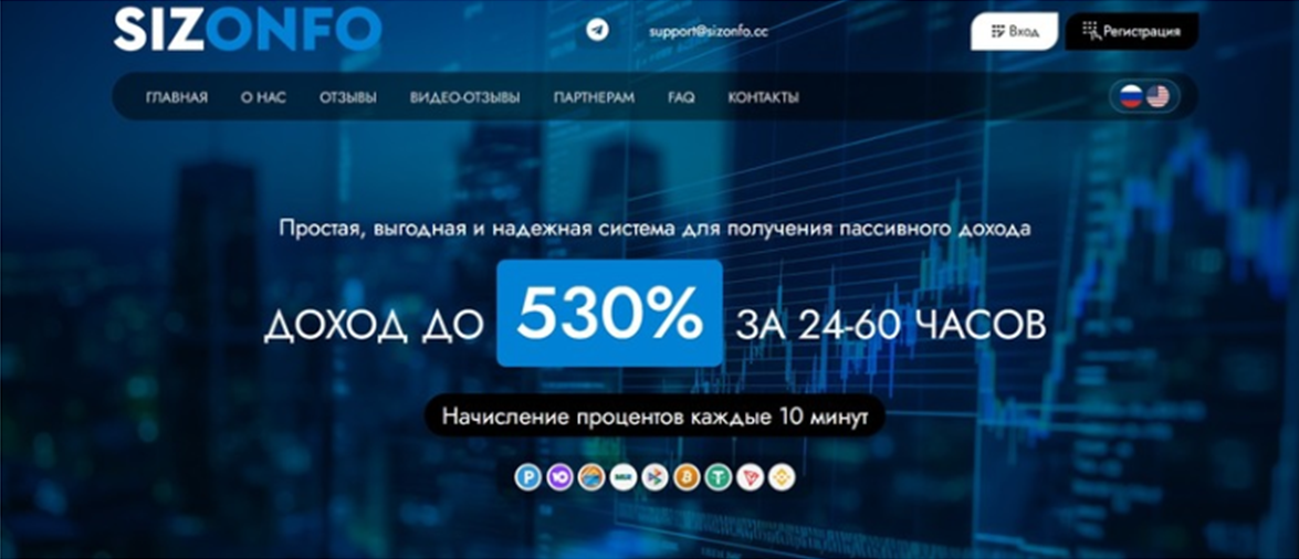 Sizonfo — инвестиционная платформа для “ленивых” инвесторов. На официальном сайте сказано, что можно вложить минимум сто рублей и получать выплаты процентов в этот же день. Причем прибыль составляет фантастические 550 процентов, а все благодаря умелым профессионалам компании.