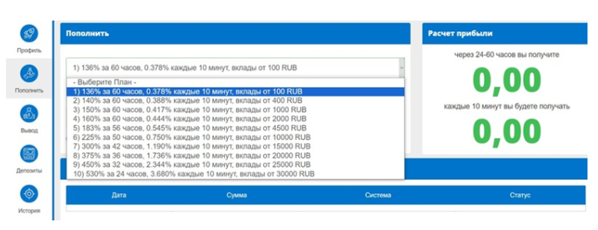 Стартовый депозит на платформе составляет 100 рублей, начисления производятся каждые 10 минут. Максимальный процент прибыли — 4 процента.