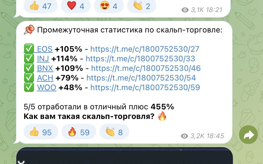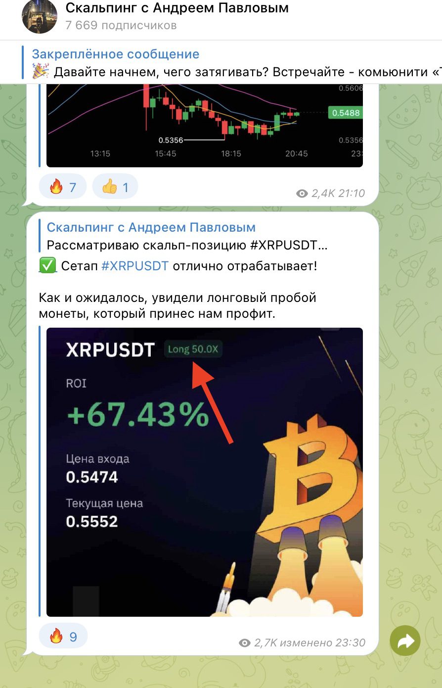 На канале регулярно появляются скальпинг-сигналы с диапазонами выхода и целевыми ценами. Трейдер, похоже, игнорирует использование стоп-лоссов и демонстрирует кредитное плечо ×50 в скриншотах прибыльных сделок. Такая практика управления рисками далека от профессиональной и приведет к потере депозита в реальных торговых сценариях.
