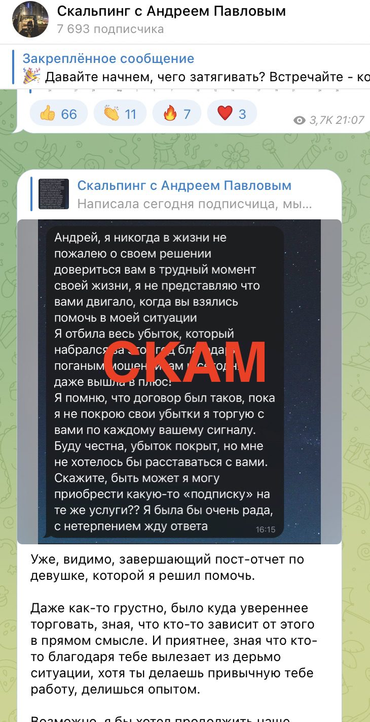 Скальпинг с Андреем Павловым — это мошенничество. Деятельность канала направлены на продажу бесполезной подписки на закрытые группы и чаты, пользуясь неопытностью трейдеров.