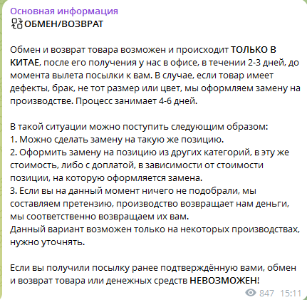 Телеграм-магазин «СкандалБайДженералс» не возвращает денежные средства, если покупатель уже получил ранее подтвержденную посылку.Создателям торгового центра можно отправлять ссылки на интересующие позиции, расположенные на витринах других магазинов. Менеджеры телеграм-шопа обещают предоставить людям такой же товар, изготовленный на производстве партнера из Китая.