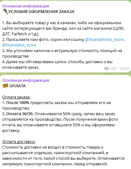 Создатели магазина одежды Skandal By Generals предлагают пользователям оформить заказ понравившихся вещей в онлайн-шопе. Торговый центр работает с гражданами по полной предоплате. Его представители обещают, что взаимодействие с платформой происходит прозрачно. Но мы встретили в сети отрицательные комментарии об этом Telegram-shop и решили проанализировать характеристики этого магазина.