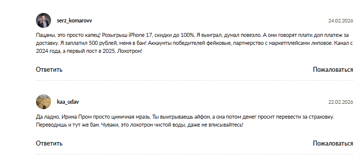 Дальше включается классическая схема псевдорозыгрыша. Людям начинают писать, что они якобы стали победителями, приз готов к отправке, но нужно оплатить стоимость товара за минусом заявленных скидок по промокодам, а также налог и растаможку. Суммы могут быть и небольшими, с расчетом на то, чтобы не вызывать сомнений и лишних вопросов. После оплаты, либо появляются требования дополнительных платежей, либо связь просто обрывается.