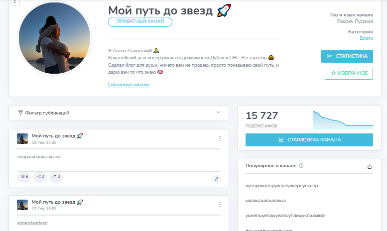 На нашем примере, в роли главного спонсора выступает некто Антон Полонский, канал Мой путь до звезд. И вот тут начинается самое интересное. Эти спонсорские каналы — пустышки. Без контента, без логики, с набором случайных символов места постов. Они нужны не для аудитории, а для цифры. Чтобы быстро накрутить подписчиков и создать видимость масштабного проекта. Это технические прокладки, не живые медиа.