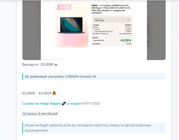 Ежедневно в ленте блога появляется 1-2 сообщения в формате товарных офферов с ссылками на Яндекс Маркет, Ozon, AliExpress. Формула подачи одинаковая: картинка товара, выгода от 20К руб., старая/новая цена, ссылка на маркетплейс, указание количества позиций и напоминание об авторизации.