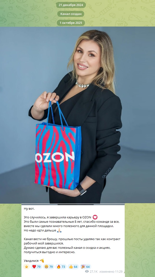 Паблик Скидочная Live (@Live discount) стартовал в TG 21 декабря 2024 года, но первая публикация датирована 1 октября 2025. В первом посте админ вместо презентации разместила сообщение о завершении своей 8-летней карьеры на Озон и якобы полной смене формата канала. Поэтому вся история удалена. На ресурсе почти 93 тыс. подписчиков, посты читает больше половины из них, доступны только положительные реакции, комментарии закрыты. Писать админу можно только по поводу рекламы, на другие вопросы она не отвечает, личный аккаунт — IRINA (@Irina Prom).