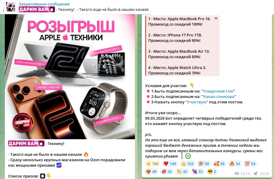 Очень часто, в канале админ размещает объявления о розыгрыше техники Apple, в их числе iPhone 17 Pro. Промокоды идут со скидками 70-80-90-100%. Условия простые — подписки на канал спонсора и Скидочная. После выполнения этих условий надо на кнопку Участвую.