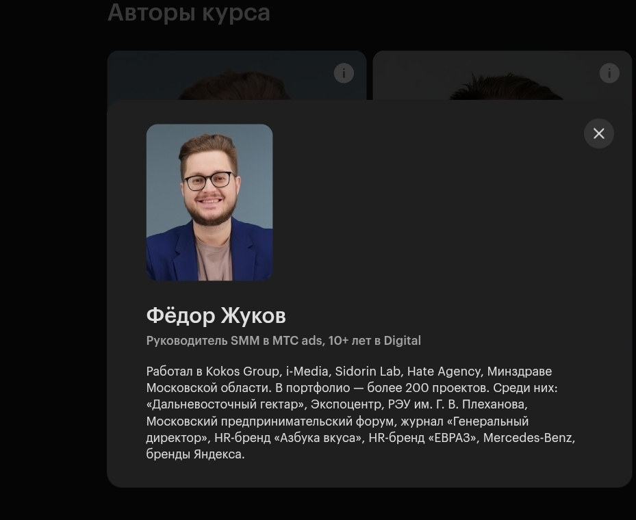 В числе авторов курса — Фёдор Жуков, руководитель SMM в МТС ads с заявленным опытом 10+ лет в Digital, Дмитрий Чинянин — «эксперт в области маркетинга, дизайна, нейросетей и фриланса», Дмитрий Фролов — президент ассоциации ARDA. Это реальные публичные люди с верифицируемой профессиональной историей, что отличает Skillbox от анонимных проектов. Однако «эксперт в области нейросетей» — размытая формулировка без четких критериев: ни портфолио проектов, ни публичных кейсов заработка именно через AI-креатив в описании нет.