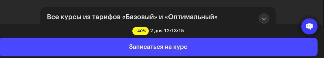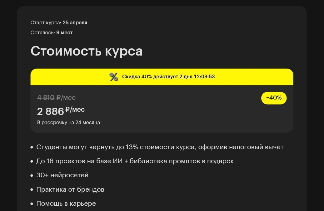 Skillbox AI Креатор продаётся с постоянной скидкой 40 — 50%. На странице курса отображается таймер обратного отсчета — якобы скидка действует определенное количество времени. Это классический маркетинговый приём создания искусственного дефицита: таймер обнуляется и запускается снова. Официальная цена тарифа «Базовый» — 4 810 рублей в месяц, «продажная» — 2 886 рублей. Ни один человек, целенаправленно ищущий этот курс, не платит полную цену — потому что скидка присутствует всегда.
