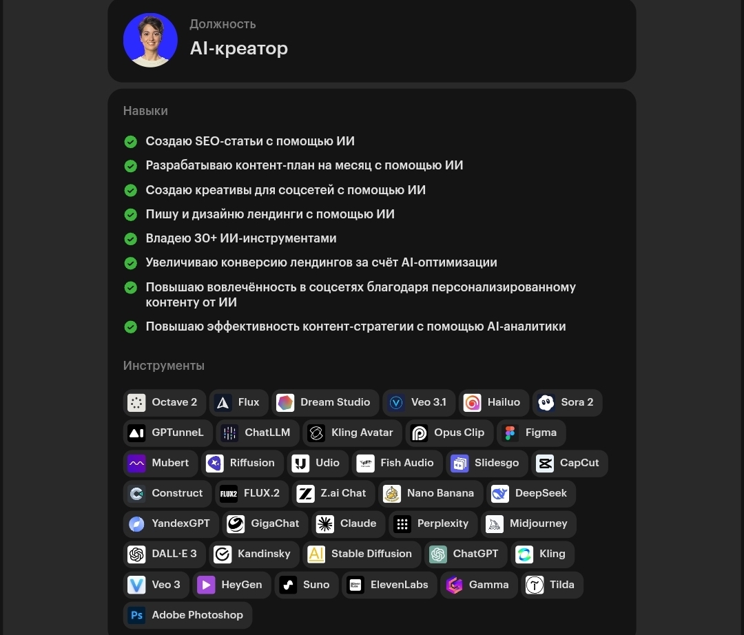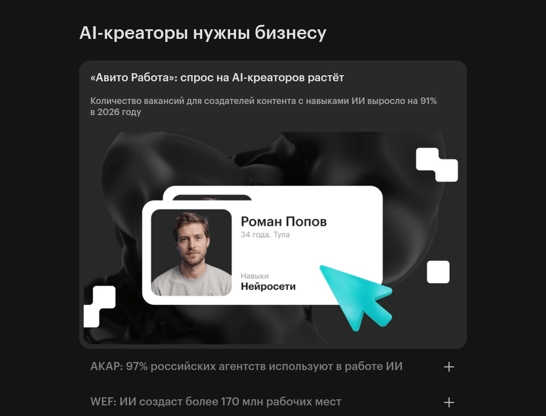 - рыночный спрос на профессию «AI-креатор» не подтвержден независимыми данными hh ru;