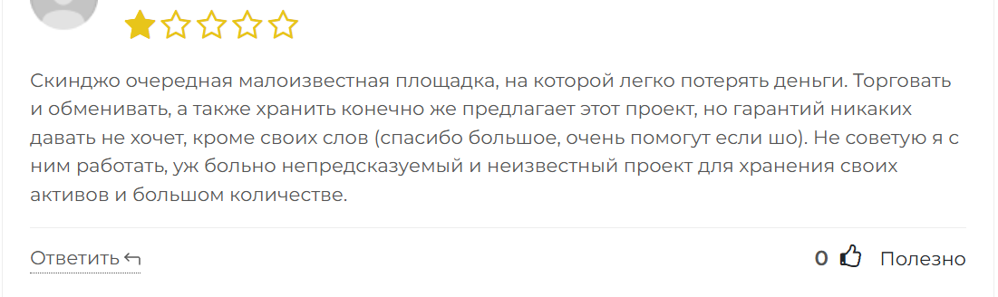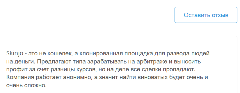 В сети отзывы о Skinjo описывают работу кошелька больше негативно. Основная претензия людей связана с невозможностью со своего счета вывести средства на другие кошельки. Клиенты пишут о длительных задержках, зависших транзакциях и полном отсутствии реакции на запросы со стороны сервиса. В некоторых случаях ожидание вывода средств затягивалось на недели. Пользователей, как правило, заманивали предложениями заработка на криптовалютном арбитраже. После внесения средств возможность их возврата отсутствовала. Положительные отзывы о «Скинджо» отсутствуют.